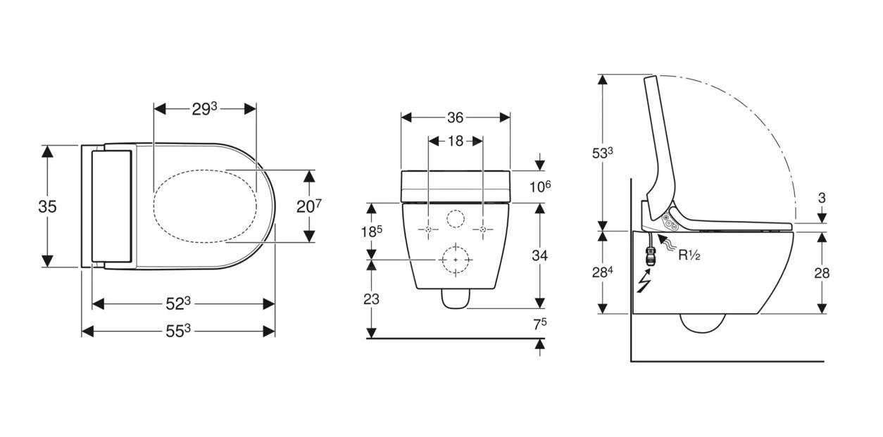 - conexión eléctrica a la red con cable flexible de tres hilos recubierto, oculto tras la cerámica del inodoro en el lado derecho