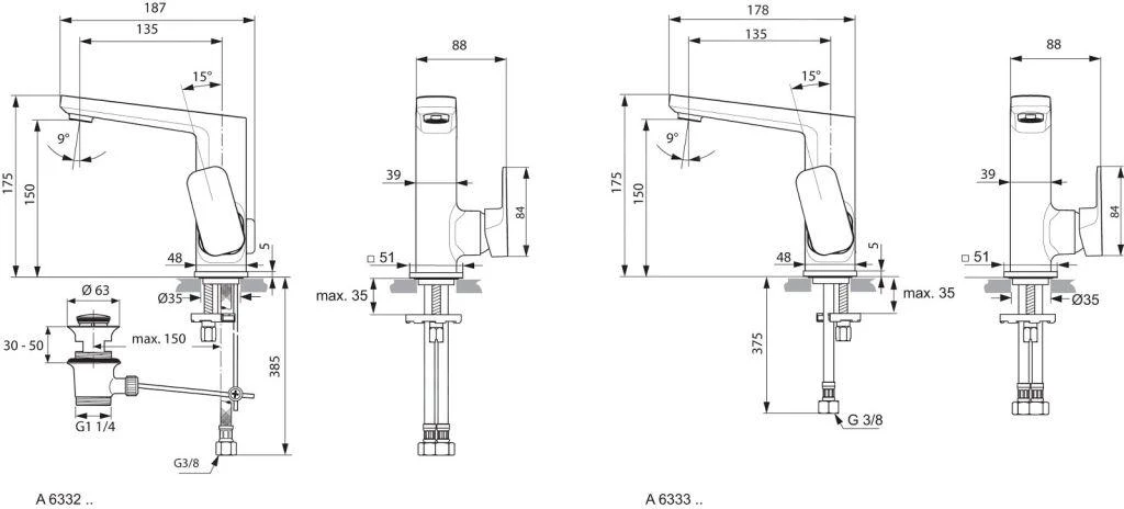 - dirección del flujo de agua ajustable en un ángulo de 9° +/- 10°