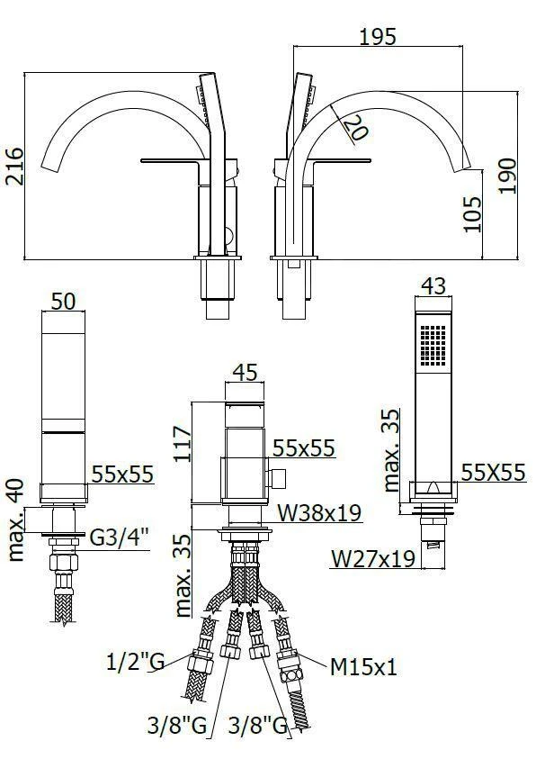 - juego de 5 mangueras de acero inoxidable de 35 cm de longitud